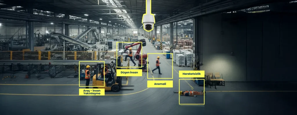 Kamera görüntüsünde insan varlığı sürekli olarak izlenir. Özellikle mesai dışı izinsiz girişler, tehlikeli bölge kontrolü veya alan boş kontrolü için kullanılır.